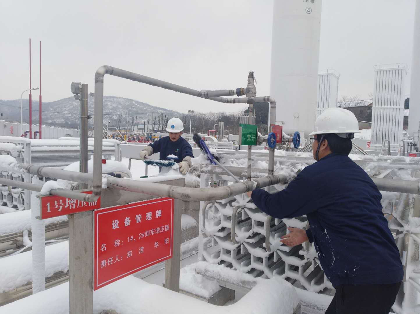 隨著低溫天氣持續(xù),我市城區(qū)日用氣量逐日攀升,12月30日已達(dá)40萬(wàn)立方左右。除21萬(wàn)方管輸氣外,其它氣源均需安慶港華高價(jià)購(gòu)進(jìn)LNG(液化天然氣)并通過(guò)北部新城LNG應(yīng)急調(diào)峰站不間斷氣化補(bǔ)充。而本次降雪恰逢元旦假期,受高速限行?;泛蛧?guó)道、省道積雪等不利因素影響,有2/3的運(yùn)送LNG來(lái)宜的罐車(chē)被迫滯留途中。面對(duì)多重挑戰(zhàn),安慶港華沉著應(yīng)對(duì),一方面多方聯(lián)系附近氣源供應(yīng)商,不惜成本保供應(yīng);另一方面晝夜不間斷清掃站前及站內(nèi)車(chē)用通道,確保運(yùn)氣罐車(chē)進(jìn)出暢通,并及時(shí)清除關(guān)鍵設(shè)施操作閥門(mén)(緊急切斷閥、手動(dòng)低溫閥)上的積雪,確保高負(fù)荷作業(yè)情況下各制氣相關(guān)設(shè)施高效運(yùn)行。
