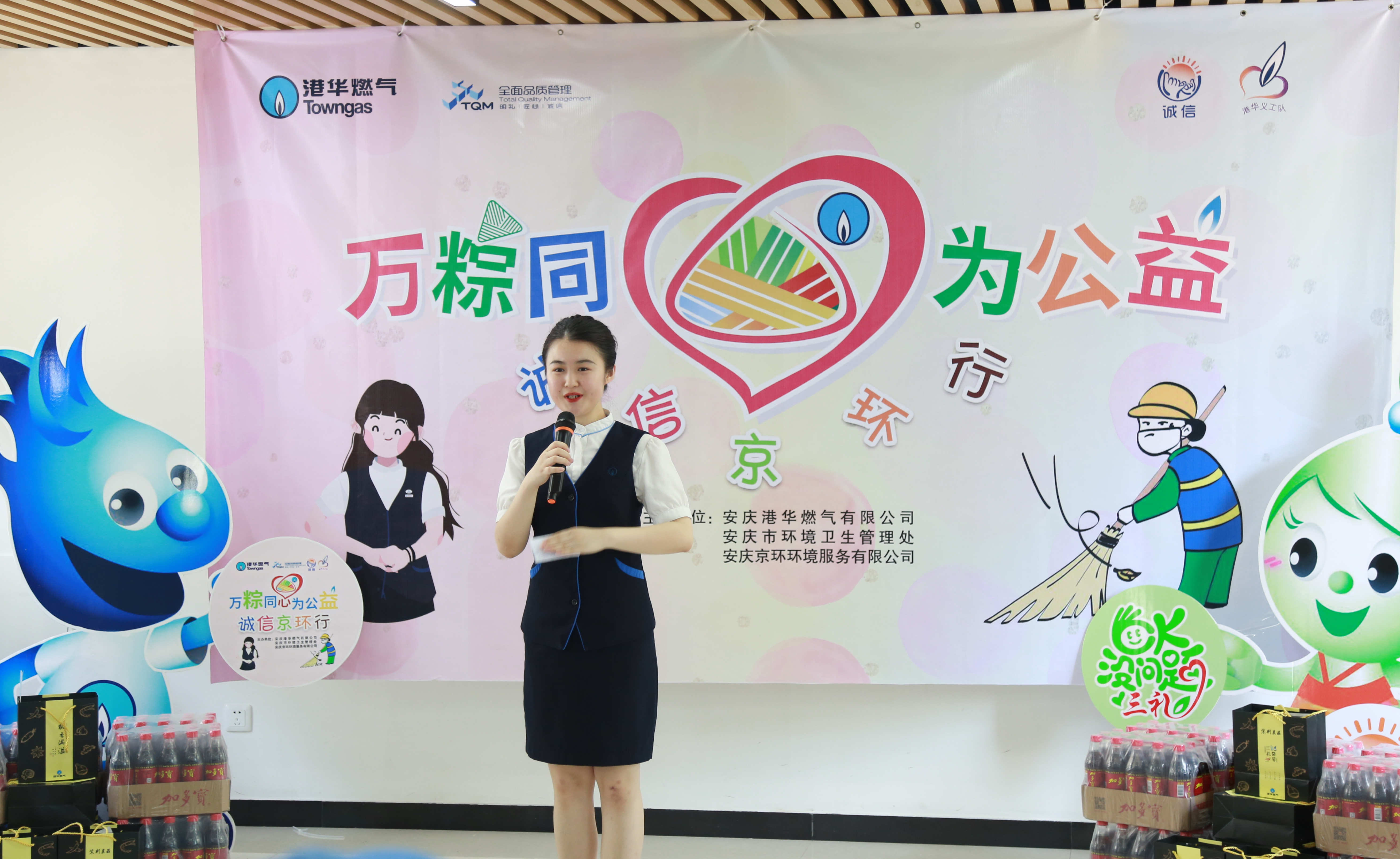 為傳遞社會正能量,帶動更多社群關(guān)注環(huán)保、關(guān)心環(huán)衛(wèi)人員,同時(shí)積極推進(jìn)港華“誠信”文化的社會傳播,6月4日下午,安慶港華走進(jìn)安慶京環(huán)環(huán)境服務(wù)有限公司,舉辦2019年“萬粽同心為公益”暨“誠信京環(huán)行”活動。安慶港華副總經(jīng)理黃蔥蔥、安慶京環(huán)工會副主席高景利分別為活動致辭,安慶港華藍(lán)焰義工隊(duì)員及京環(huán)環(huán)衛(wèi)工代表共50余人參加活動。