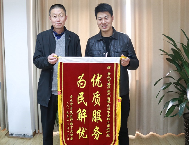 12月16日上午,市開發(fā)區(qū)野妹中式快餐負責人來到安慶港華,將一面繡有“優(yōu)質(zhì)服務 為民解憂”的錦旗,贈與公司工商運行組表示感謝。