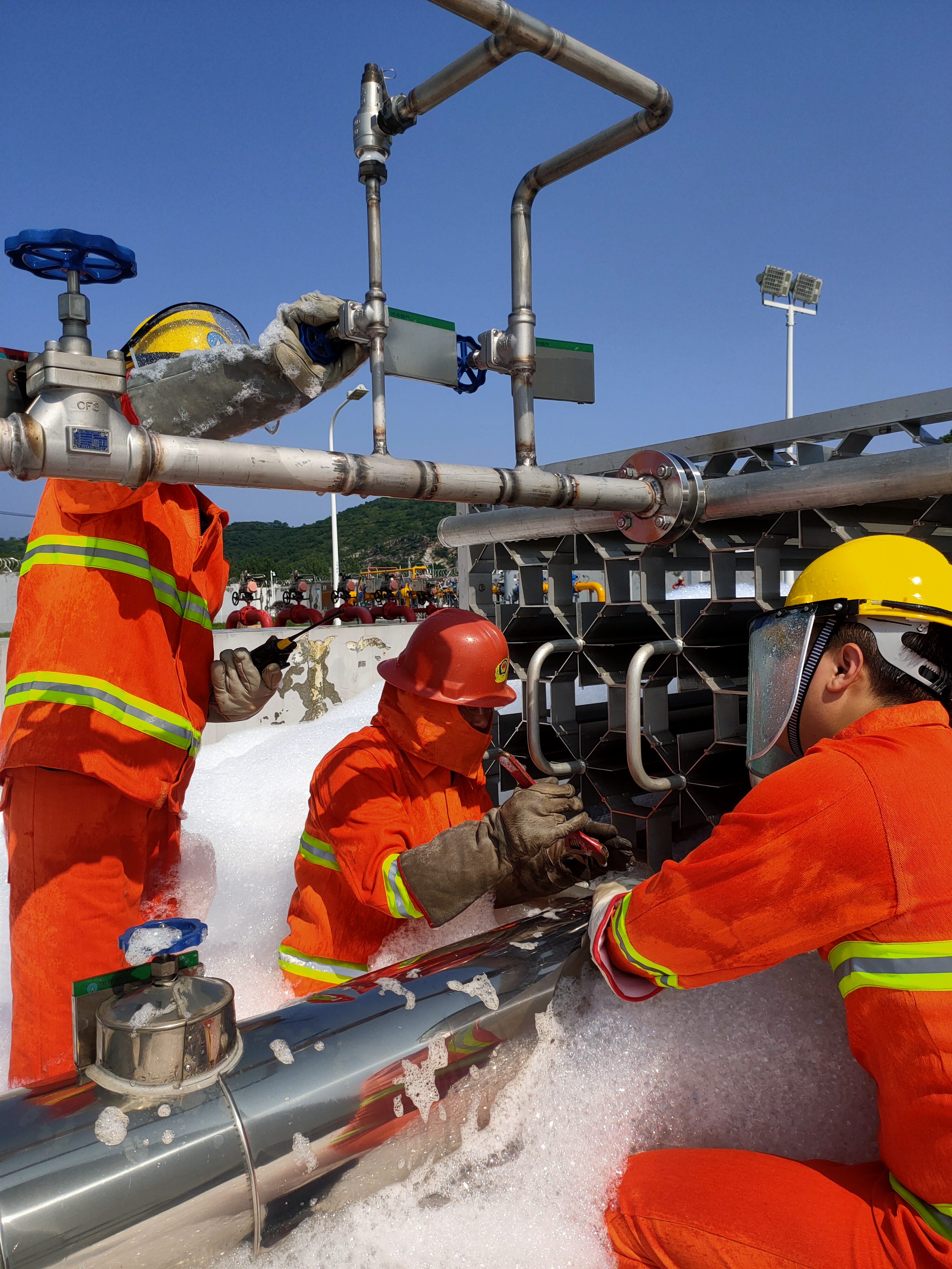 演練模擬了LNG站在氣化作業(yè)時(shí)出現(xiàn)儲(chǔ)罐增壓撬進(jìn)液法蘭泄漏,罐區(qū)低溫探測(cè)器報(bào)警,聯(lián)動(dòng)啟動(dòng)泡沫發(fā)生器,泡沫迅速覆蓋泄漏區(qū)域。站控室值守人員迅速上報(bào)并立刻按下PLC的ESD緊急按鍵切斷所有氣動(dòng)閥門,安保人員拉起警戒線負(fù)責(zé)警戒。在確認(rèn)現(xiàn)場(chǎng)情況和泄漏位置后,搶險(xiǎn)人員迅速穿戴搶險(xiǎn)裝備前往泄漏點(diǎn)開展緊急搶險(xiǎn)維修。演練歷時(shí)30分鐘,整個(gè)過程緊張有序、分工明確、處置得當(dāng)。