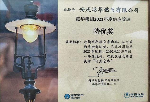 近日,安慶港華喜獲港華集團(tuán)2021年度“供應(yīng)管理特優(yōu)獎(jiǎng)”,這也是安慶港華繼獲“優(yōu)秀倉(cāng)庫(kù)”獎(jiǎng)項(xiàng)后取得的又一殊榮。