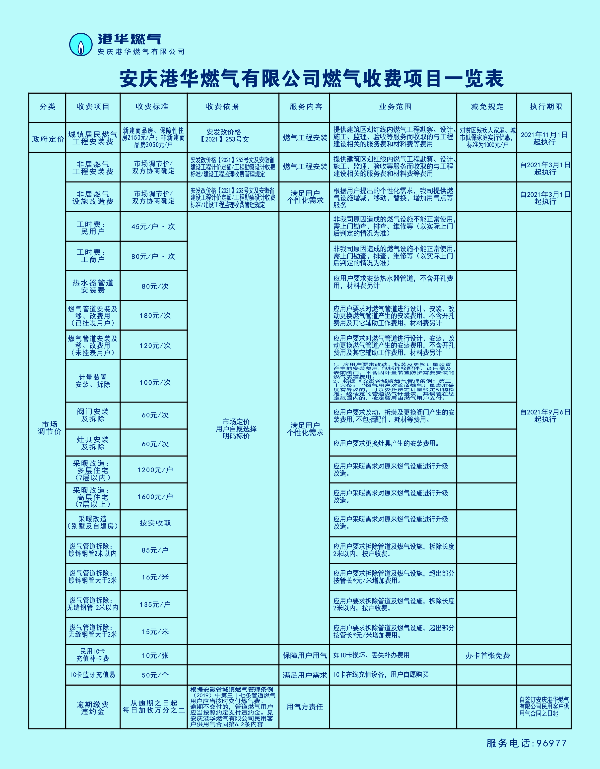 安慶市供氣行業(yè)收費項目清單