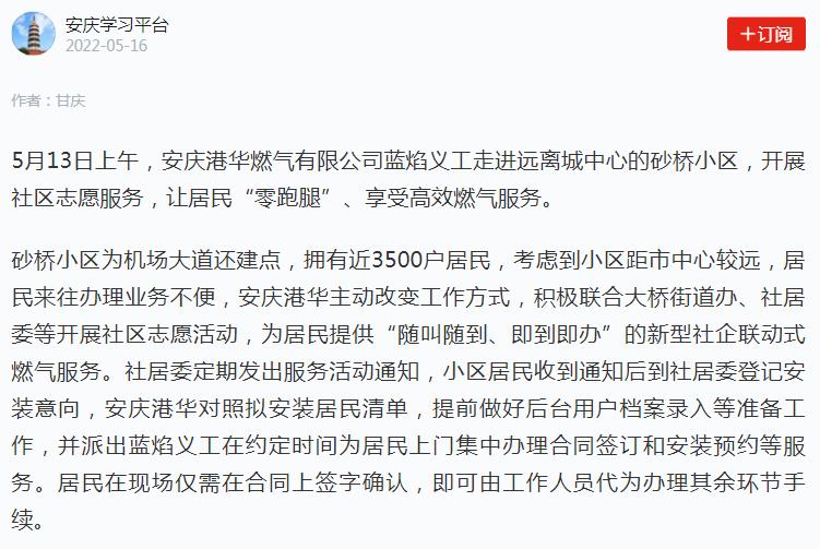 安慶:服務隨叫隨到 業(yè)務即到即辦 打造燃氣社區(qū)服務新模式(轉(zhuǎn)載于學習強國)