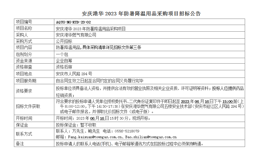安慶港華2023年防暑降溫用品采購項(xiàng)目招標(biāo)公告