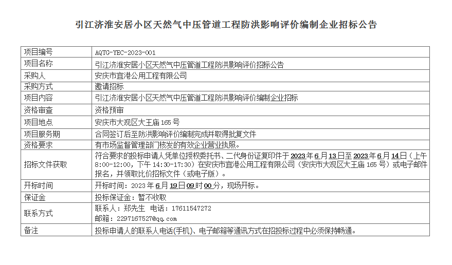 引江濟(jì)淮安居小區(qū)天然氣中壓管道工程防洪影響評價編制企業(yè)招標(biāo)公告