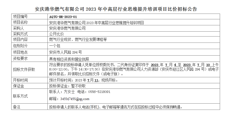 安慶港華燃氣有限公司2023年中高層行業(yè)思維提升培訓(xùn)項目比價招標公告