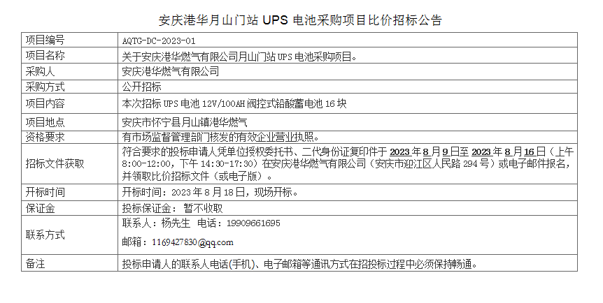 安慶港華月山門站UPS電池采購項目比價招標(biāo)公告