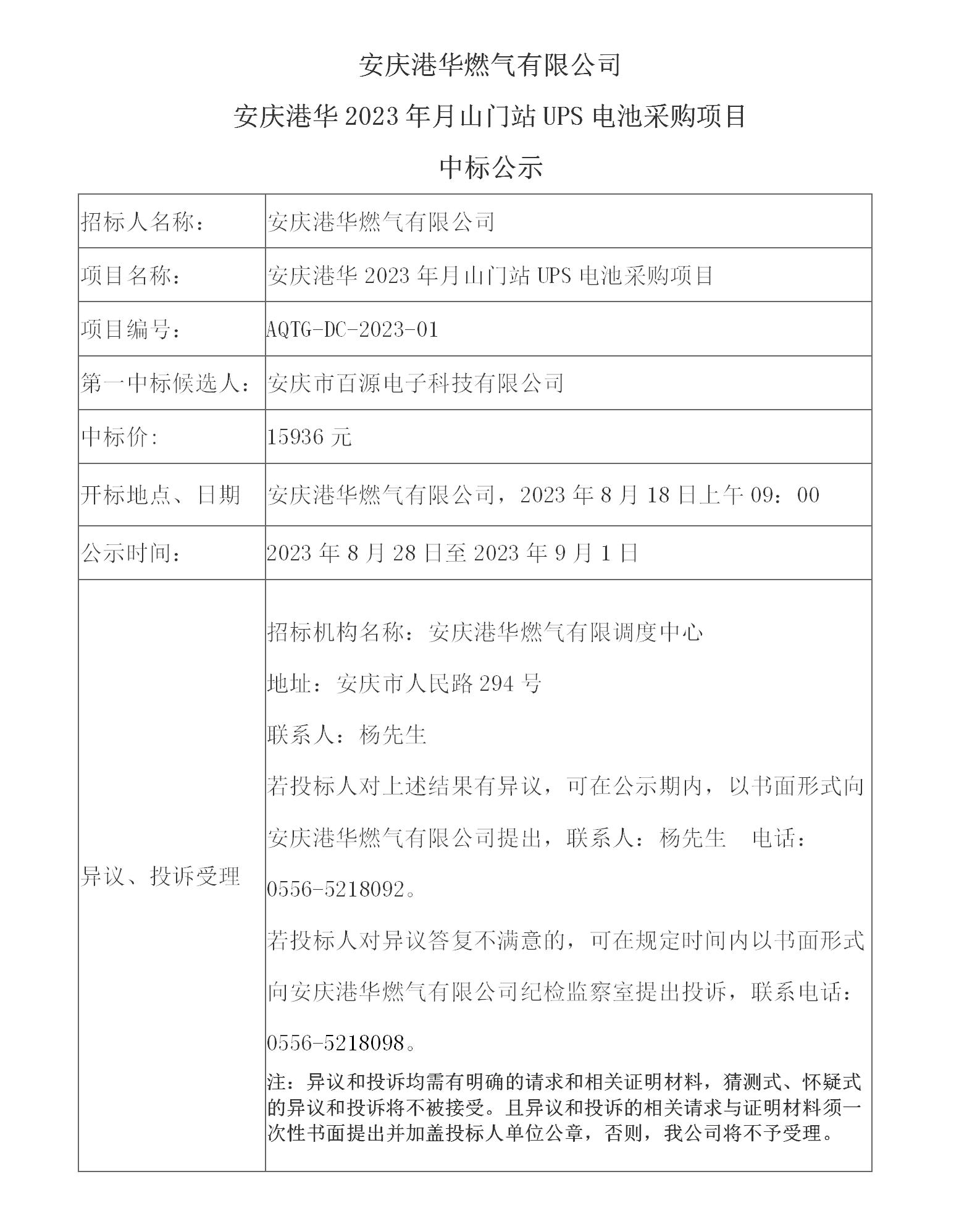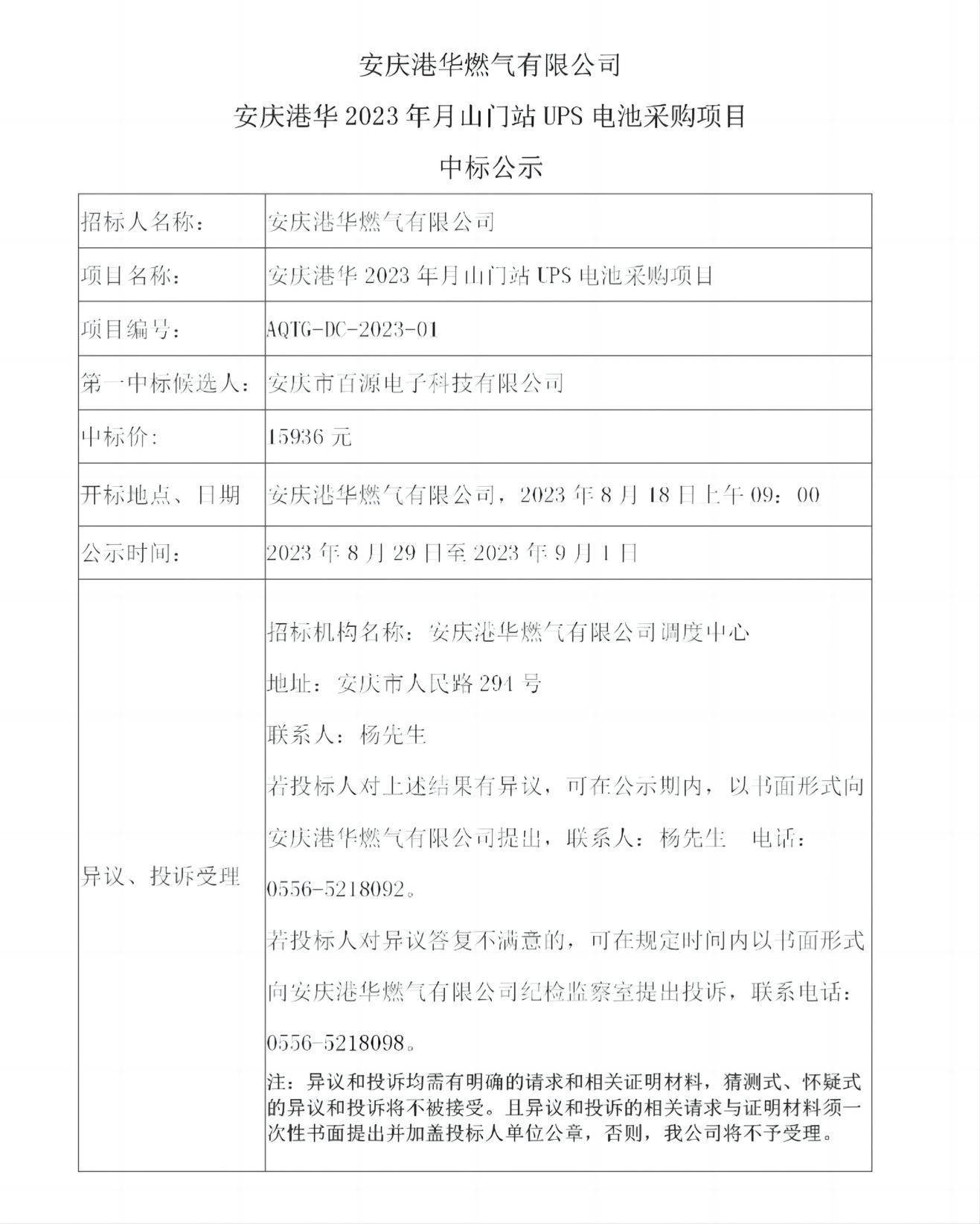 安慶港華燃氣有限公司 安慶港華2023年月山門站UPS電池采購項目 中標公示