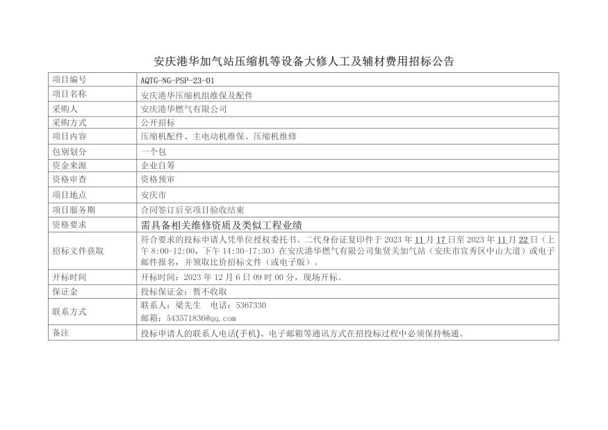 安慶港華加氣站壓縮機(jī)大修項目招標(biāo)公告
