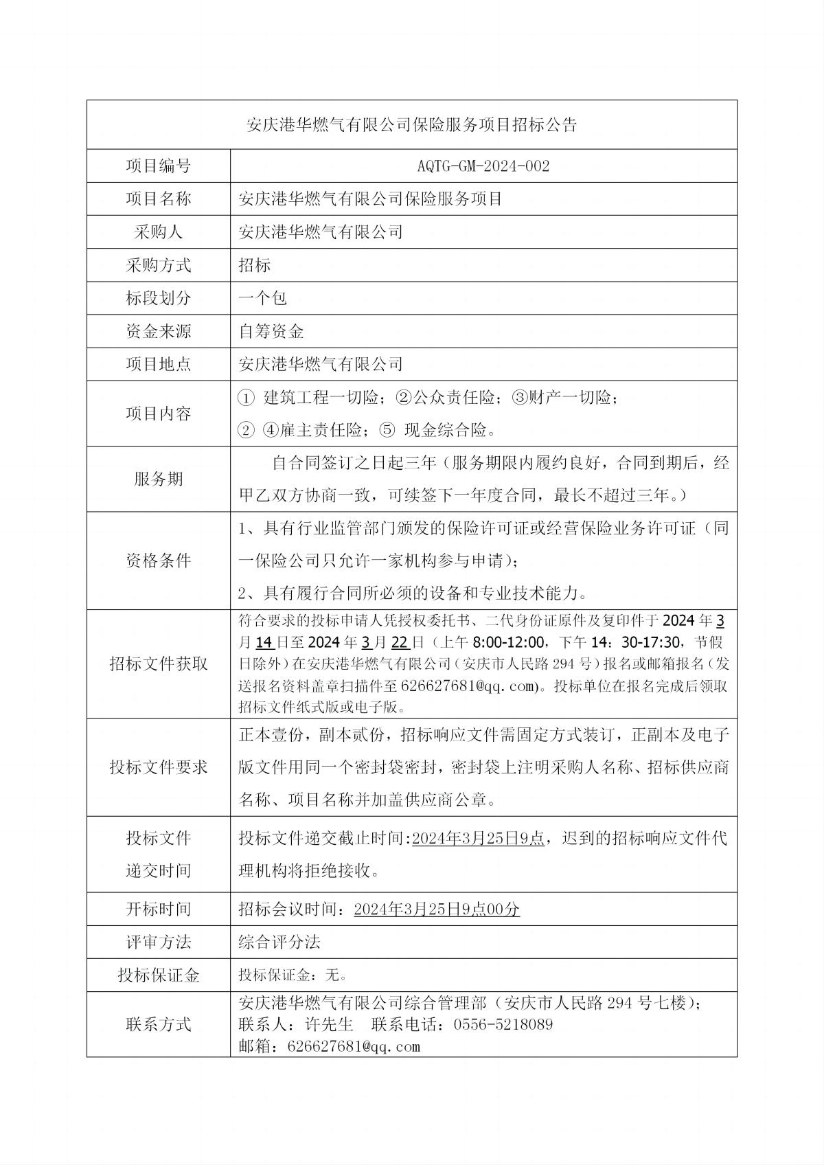 安慶港華燃?xì)庥邢薰拒囕v保險(xiǎn)服務(wù)項(xiàng)目招標(biāo)公告
