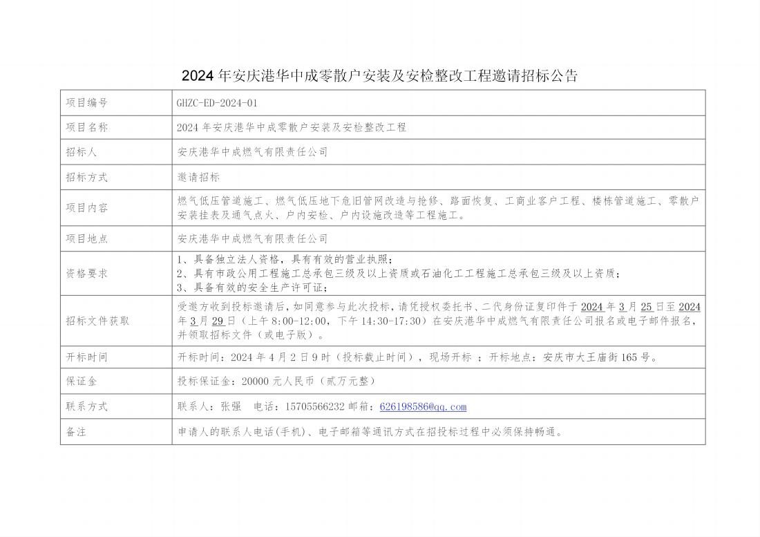 2024年安慶港華中成零散戶安裝及安檢整改工程邀請招標(biāo)公告