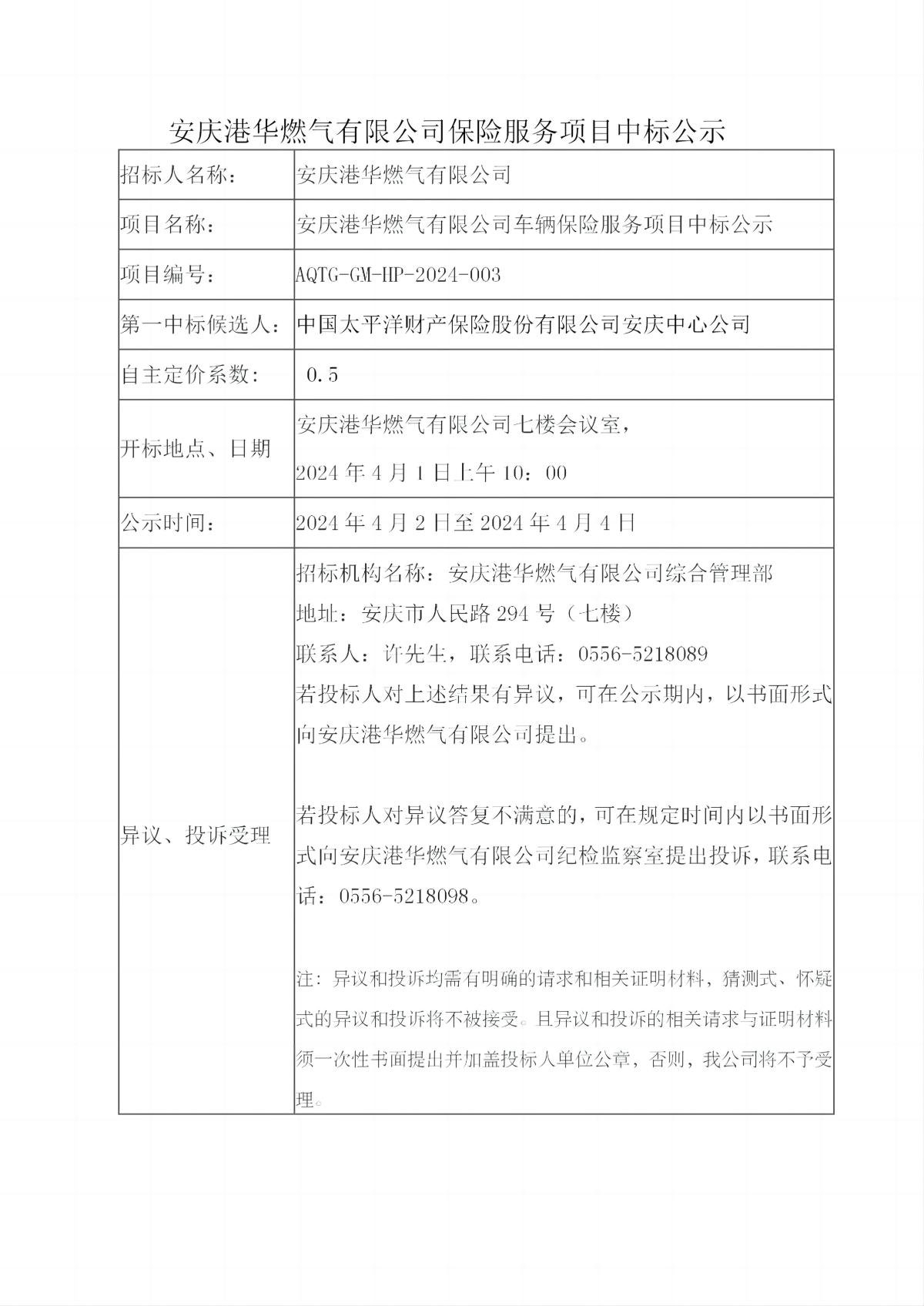 安慶港華燃?xì)庥邢薰颈kU服務(wù)項目中標(biāo)公示