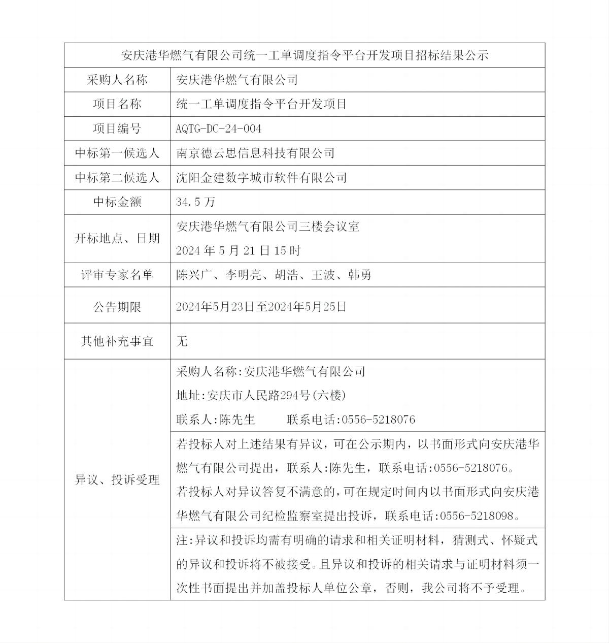 安慶港華燃?xì)庥邢薰窘y(tǒng)一工單調(diào)度指令平臺(tái)開(kāi)發(fā)項(xiàng)目招標(biāo)結(jié)果公示