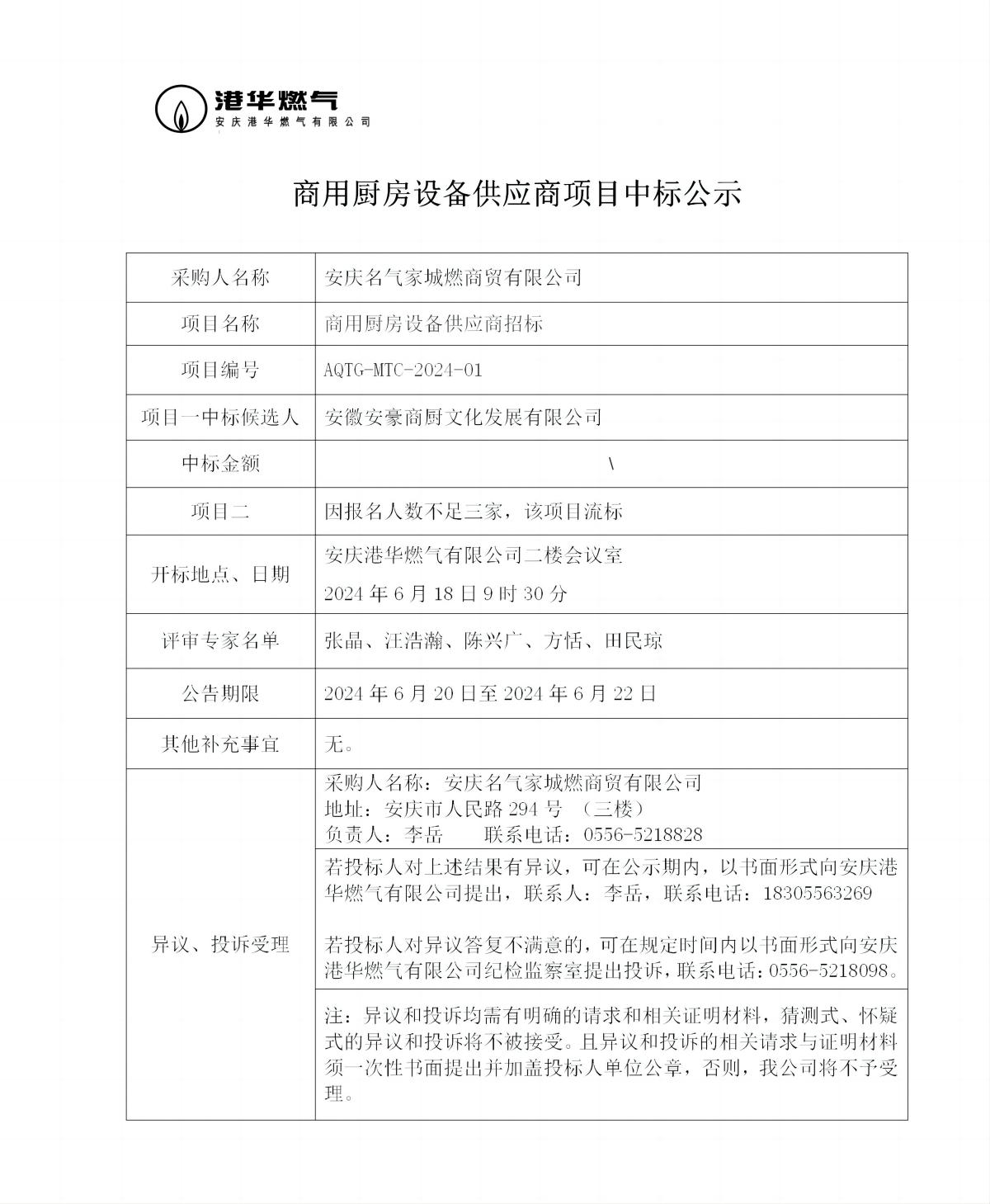 商用廚房設(shè)備供應(yīng)商項目中標公示
