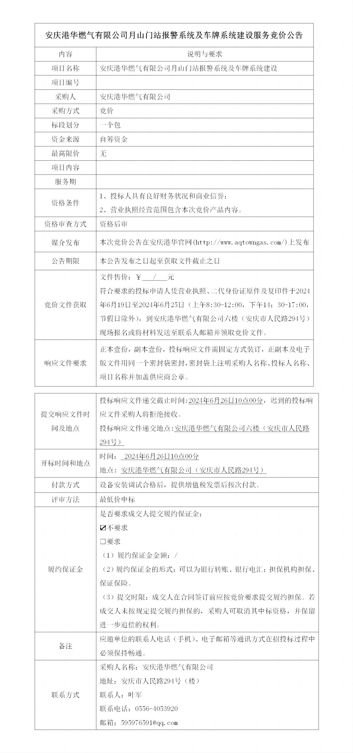 安慶港華燃?xì)庥邢薰驹律介T(mén)站報(bào)警系統(tǒng)及車(chē)牌系統(tǒng)建設(shè)服務(wù)競(jìng)價(jià)公告