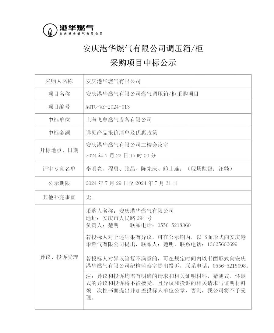 安慶港華燃?xì)庥邢薰菊{(diào)壓箱/柜采購(gòu)項(xiàng)目中標(biāo)公示