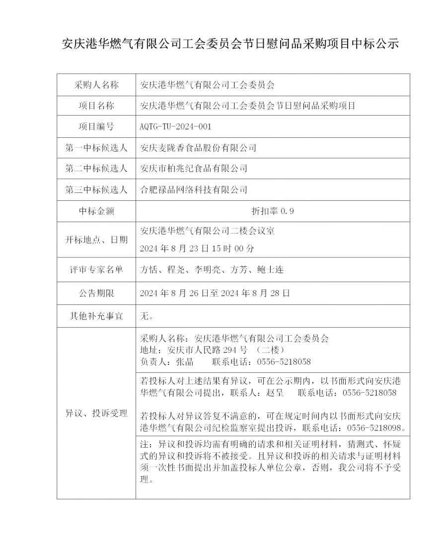 安慶港華燃氣有限公司工會委員會節(jié)日慰問品采購項目中標公示