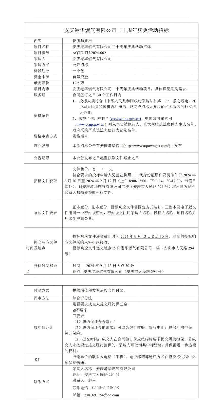 安慶港華燃氣有限公司二十周年慶典活動招標