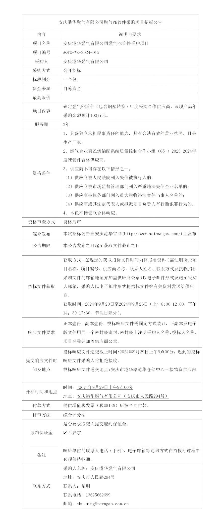 安慶港華燃氣有限公司燃氣PE管件采購項目招標公告