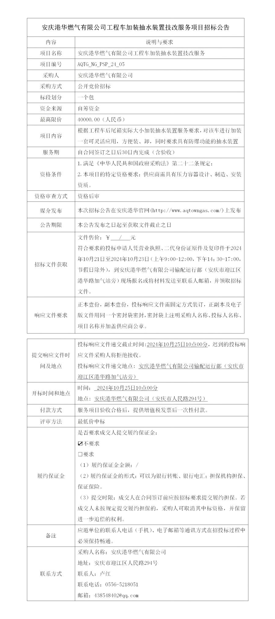 安慶港華燃氣有限公司工程車加裝抽水裝置技改服務(wù)項目招標(biāo)公告