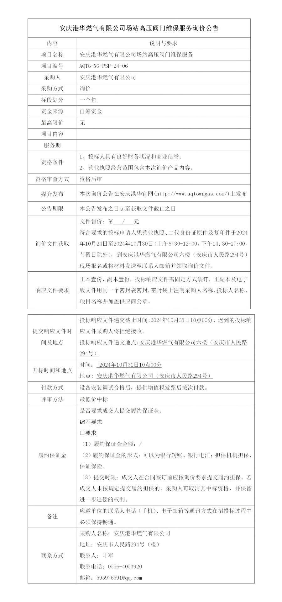 安慶港華燃?xì)庥邢薰緢稣靖邏洪y門維保服務(wù)詢價(jià)公告