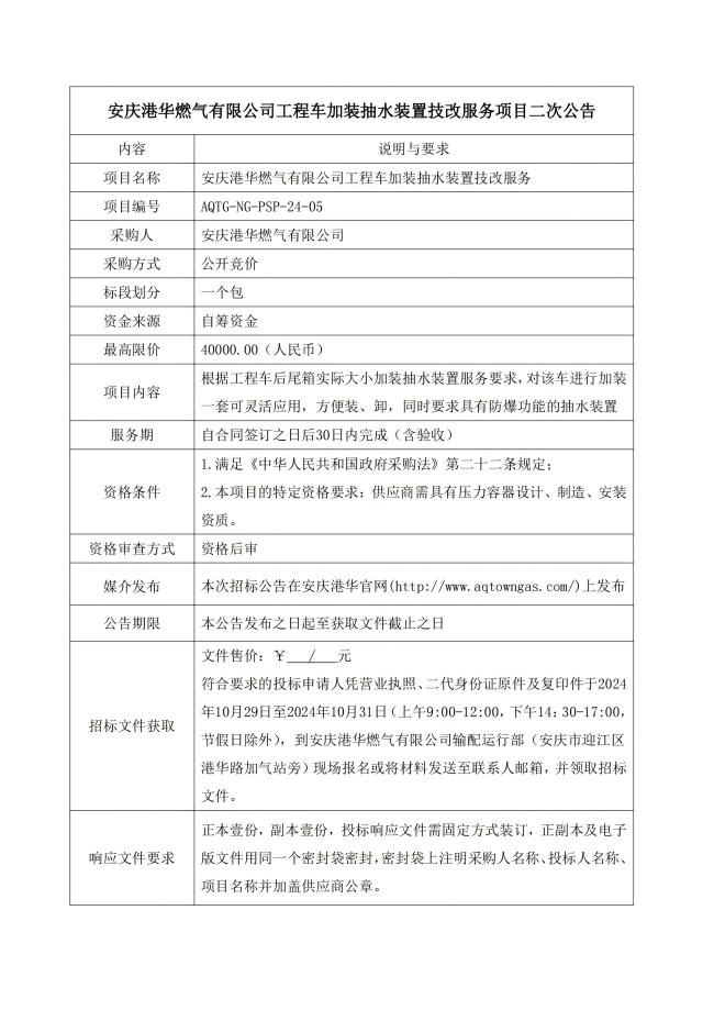 安慶港華燃?xì)庥邢薰竟こ誊嚰友b抽水裝置技改服務(wù)項(xiàng)目二次公告