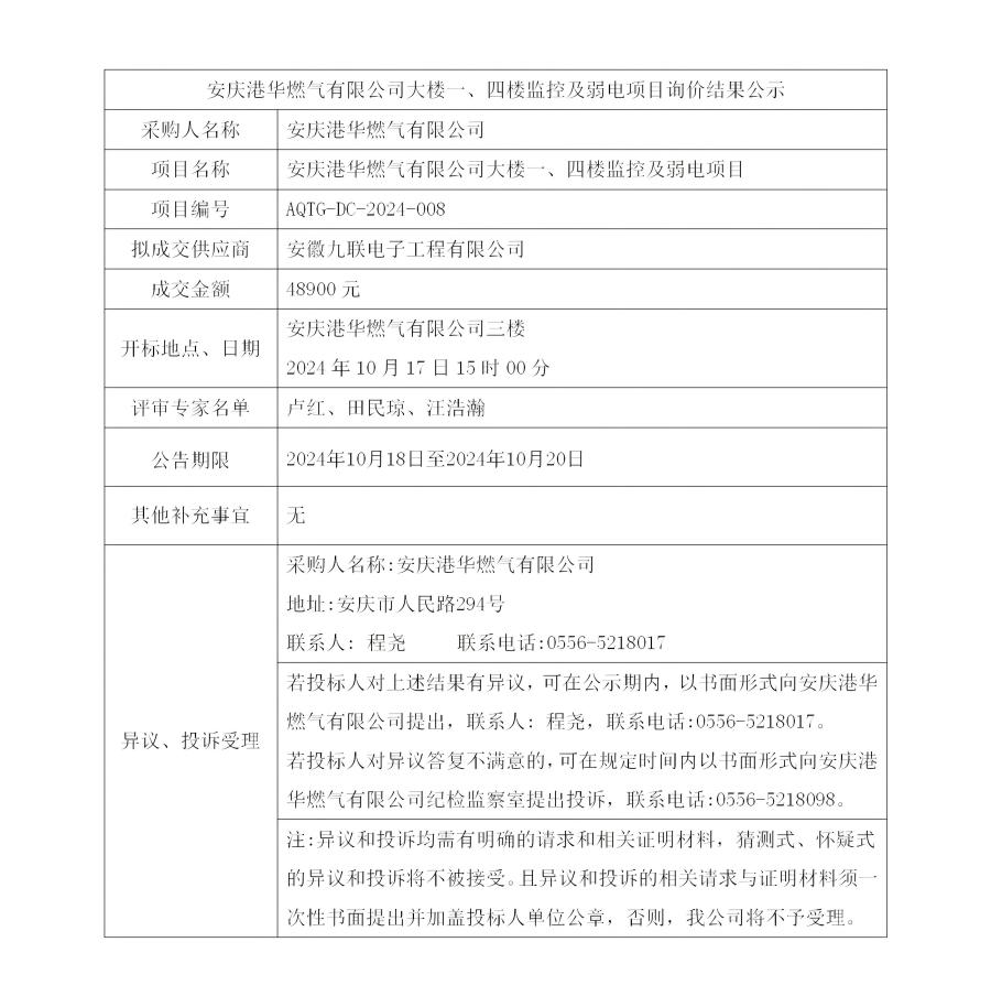 安慶港華燃?xì)庥邢薰敬髽且弧⑺臉潜O(jiān)控及弱電項目詢價結(jié)果公示