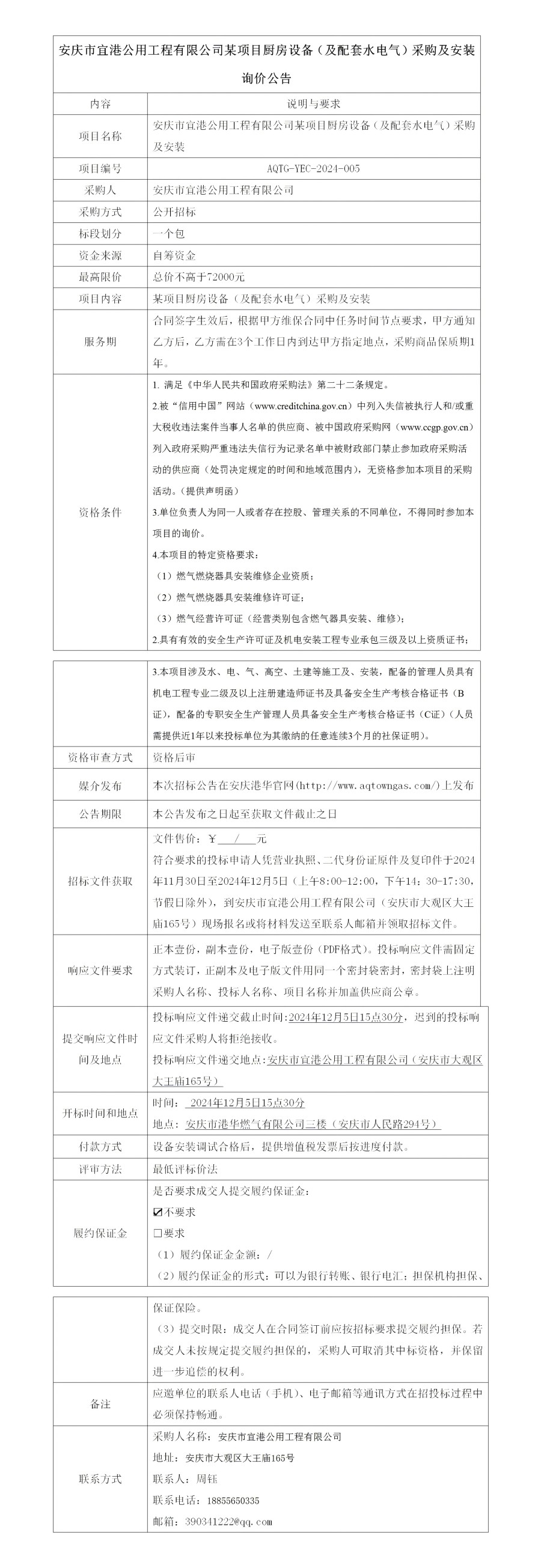 安慶市宜港公用工程有限公司某項(xiàng)目廚房設(shè)備(及配套水電氣)采購(gòu)及安裝詢(xún)價(jià)公告