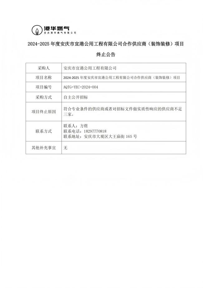 2024-2025 年度安慶市宜港公用工程有限公司合作供應(yīng)商(裝飾裝修)項(xiàng)目終止公告