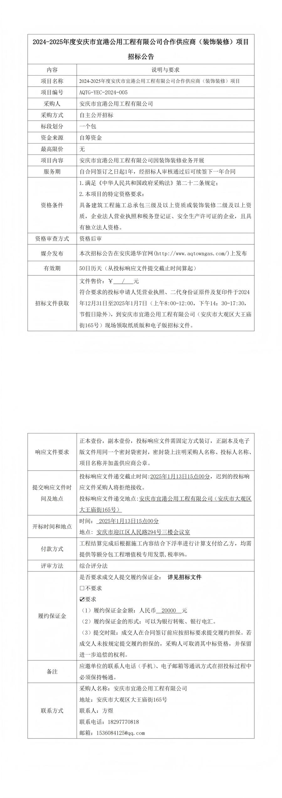 2024-2025年度安慶市宜港公用工程有限公司合作供應(yīng)商(裝飾裝修)項(xiàng)目 招標(biāo)公告