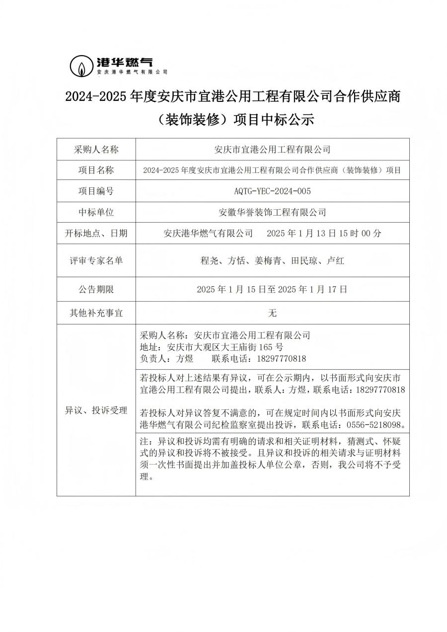 2024-2025 年度安慶市宜港公用工程有限公司合作供應(yīng)商 (裝飾裝修)項目中標公示
