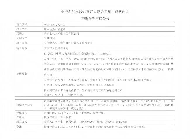 安慶名氣家城燃商貿(mào)有限公司集中供熱產(chǎn)品采購競價招標公告