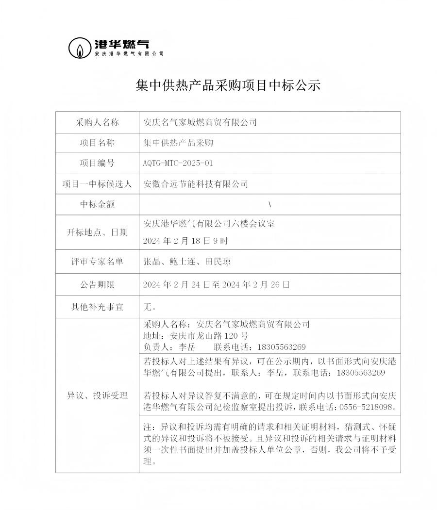 集中供熱產(chǎn)品采購項目中標公示