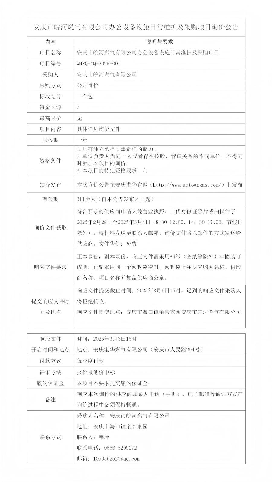 安慶市皖河燃氣有限公司辦公設備設施日常維護及采購項目詢價公告