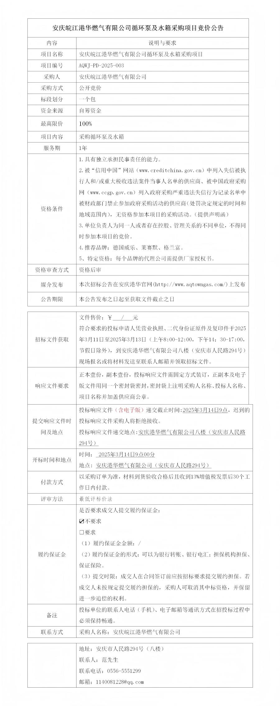安慶皖江港華燃?xì)庥邢薰狙h(huán)泵及水箱采購(gòu)項(xiàng)目競(jìng)價(jià)公告