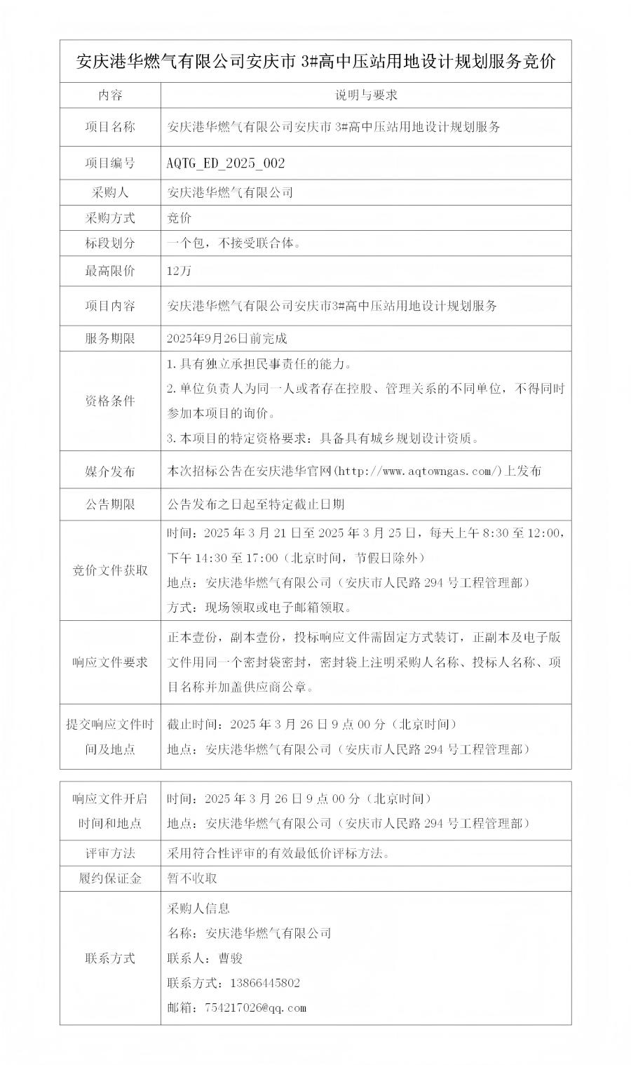 安慶港華燃氣有限公司安慶市3#高中壓站用地設計規(guī)劃服務競價