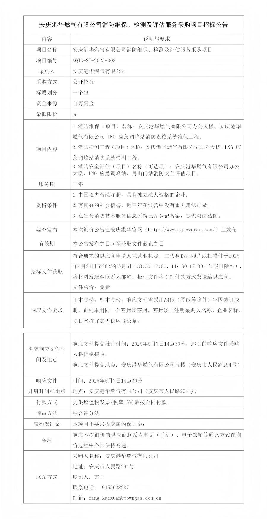 安慶港華燃?xì)庥邢薰鞠谰S保、檢測及評(píng)估服務(wù)采購項(xiàng)目招標(biāo)公告