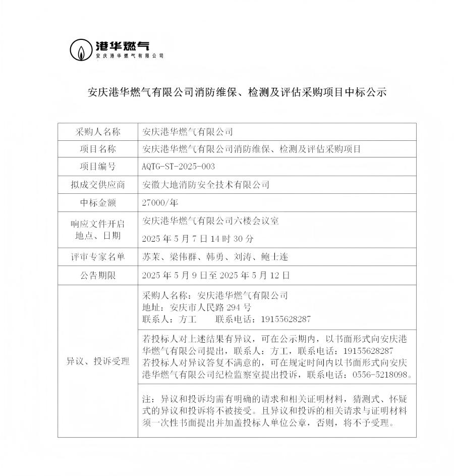 安慶港華燃氣有限公司消防維保、檢測及評估采購項目中標公示