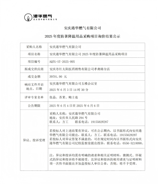 安慶港華燃?xì)庥邢薰?025年度防暑降溫用品采購(gòu)項(xiàng)目詢價(jià)結(jié)果公示