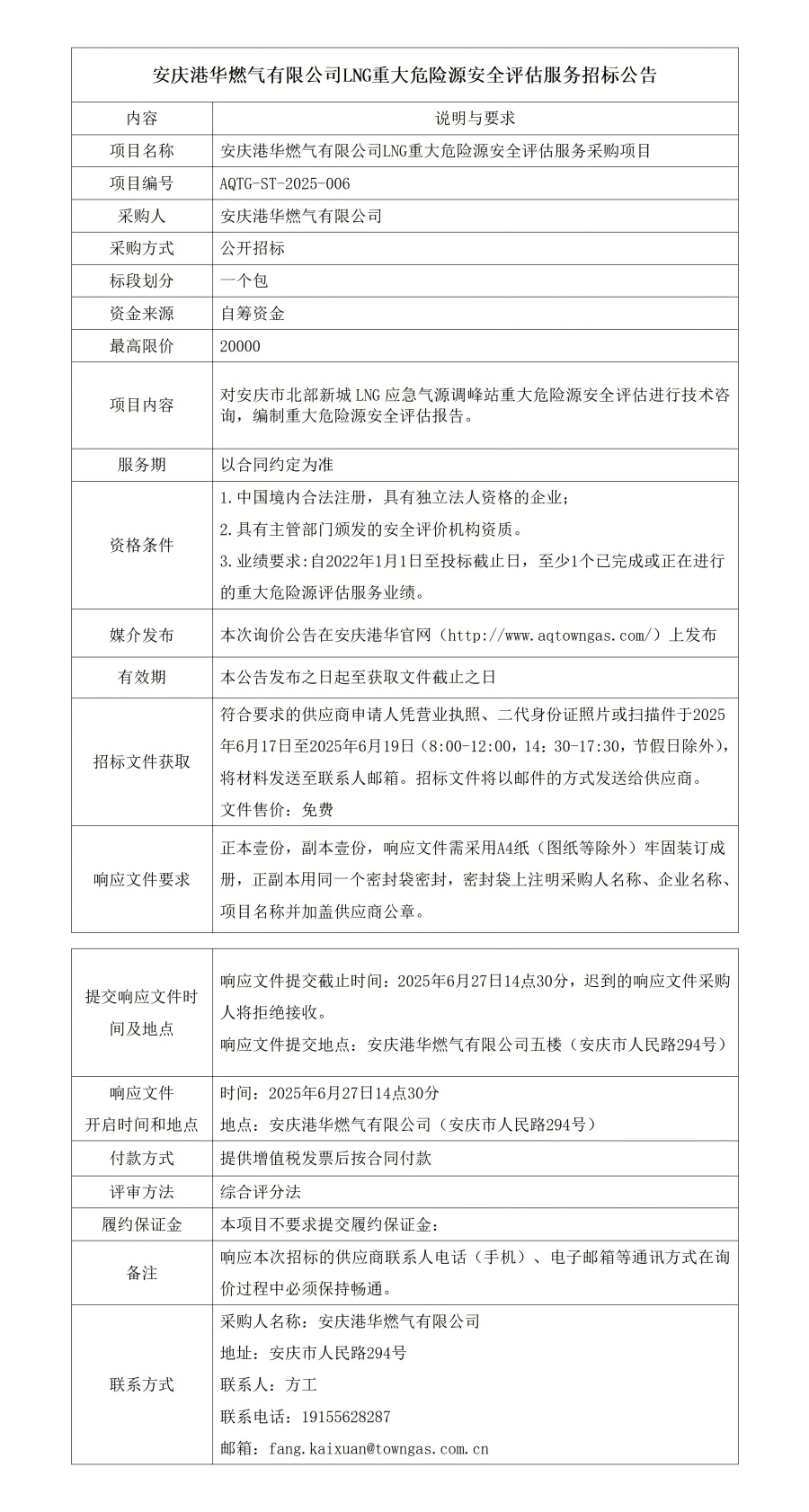 安慶港華燃?xì)庥邢薰綥NG重大危險源安全評估服務(wù)招標(biāo)公告