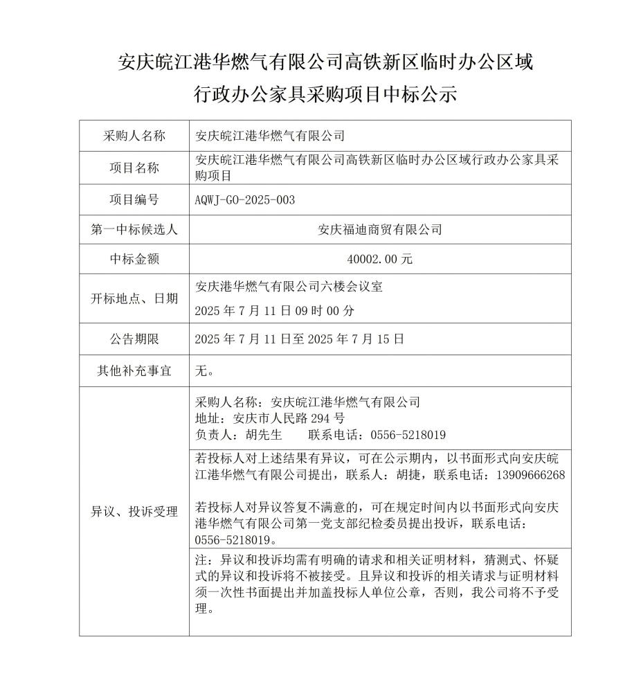 安慶皖江港華燃?xì)庥邢薰靖哞F新區(qū)臨時辦公區(qū)域行政辦公家具采購項(xiàng)目中標(biāo)公示