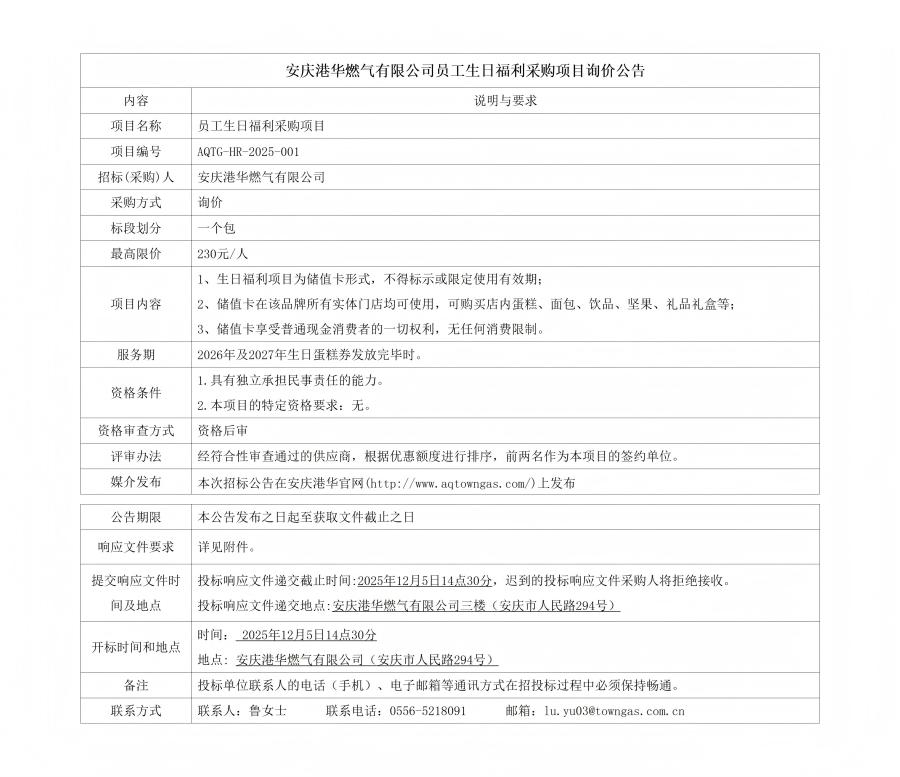 安慶港華燃?xì)庥邢薰締T工生日福利采購項(xiàng)目詢價公告