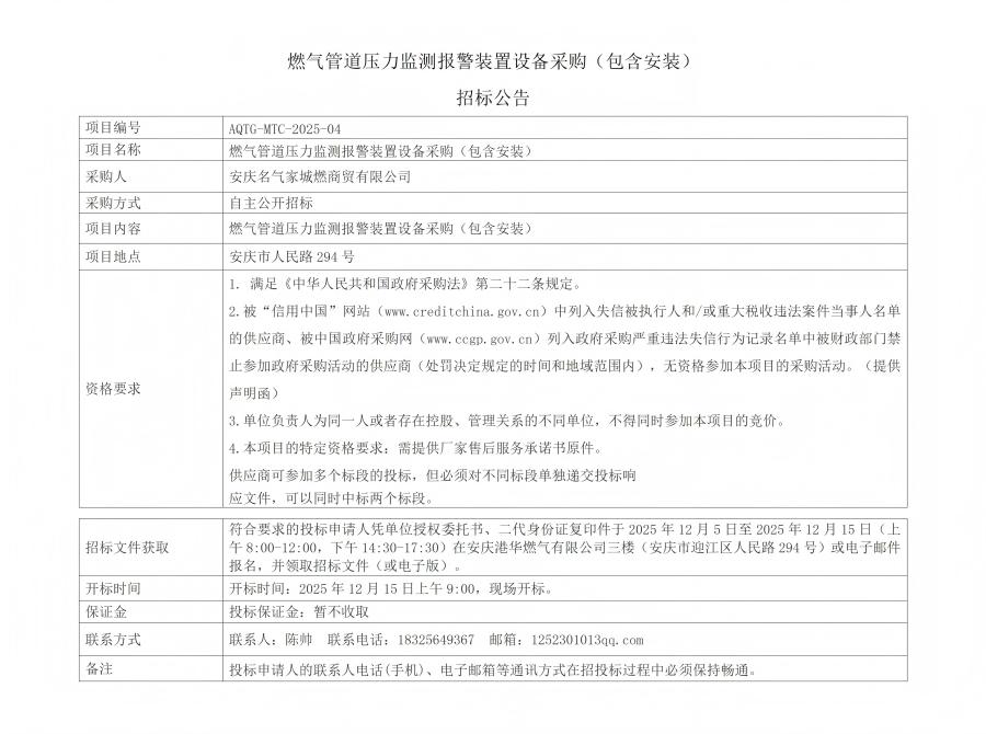 燃?xì)夤艿缐毫ΡO(jiān)測報(bào)警裝置設(shè)備采購(包含安裝)招標(biāo)公告