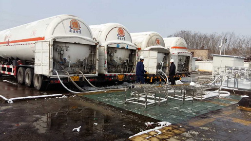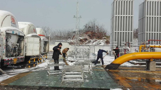圖為1月23日,LNG釋放站工作人員在進(jìn)行儲罐倒罐作業(yè)、清掃積雪