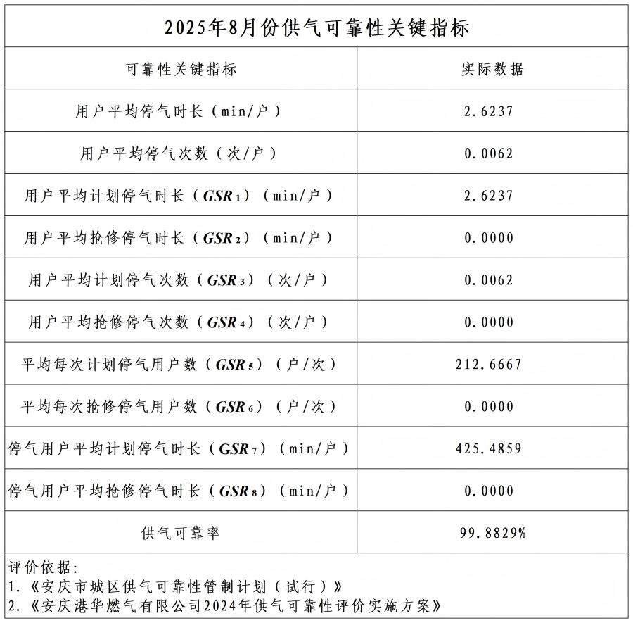 2025年8月份供氣可靠性關(guān)鍵指標